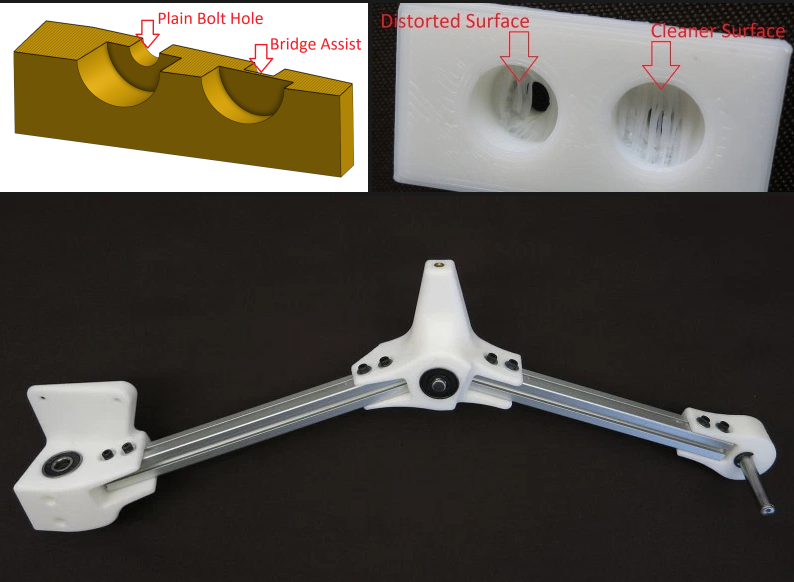 還有一點需要考慮的是,當螺栓孔不能很好地與印刷床對齊時,會突出。我們可以通過創(chuàng)建覆蓋螺栓孔的薄層(2-3層高度厚)來幫助我們的打印機橋接奇怪的螺栓頭表面,該螺栓孔可以在用于其目的之后通過鉆機清理。與典型的打印支持解決方案相比,這些打印機更容易拆卸并消耗更少的材料。