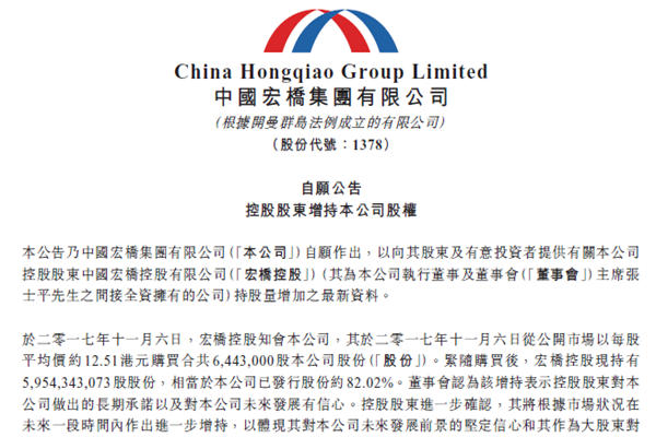 中國(guó)宏橋近日發(fā)布公告稱,其控股股東宏橋控股知會(huì)公司,將于2017年11月6日從公開市場(chǎng)以每股均勻價(jià)約12.51港元購(gòu)置合共644.3萬(wàn)股公司股份。緊隨購(gòu)置后,宏橋控股現(xiàn)持有約59.54億股股份,相當(dāng)于公司已發(fā)行股份約82.02%。記者從公開材料查詢后發(fā)現(xiàn),宏橋控股為公司執(zhí)行董事及董事會(huì)主席張士平間接全資具有的公司。