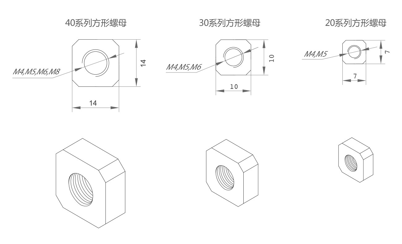 方形螺母是國際型材的專用螺母,用在國際型材上連接各種配件,安裝時需要預先放進型材的槽坑內。