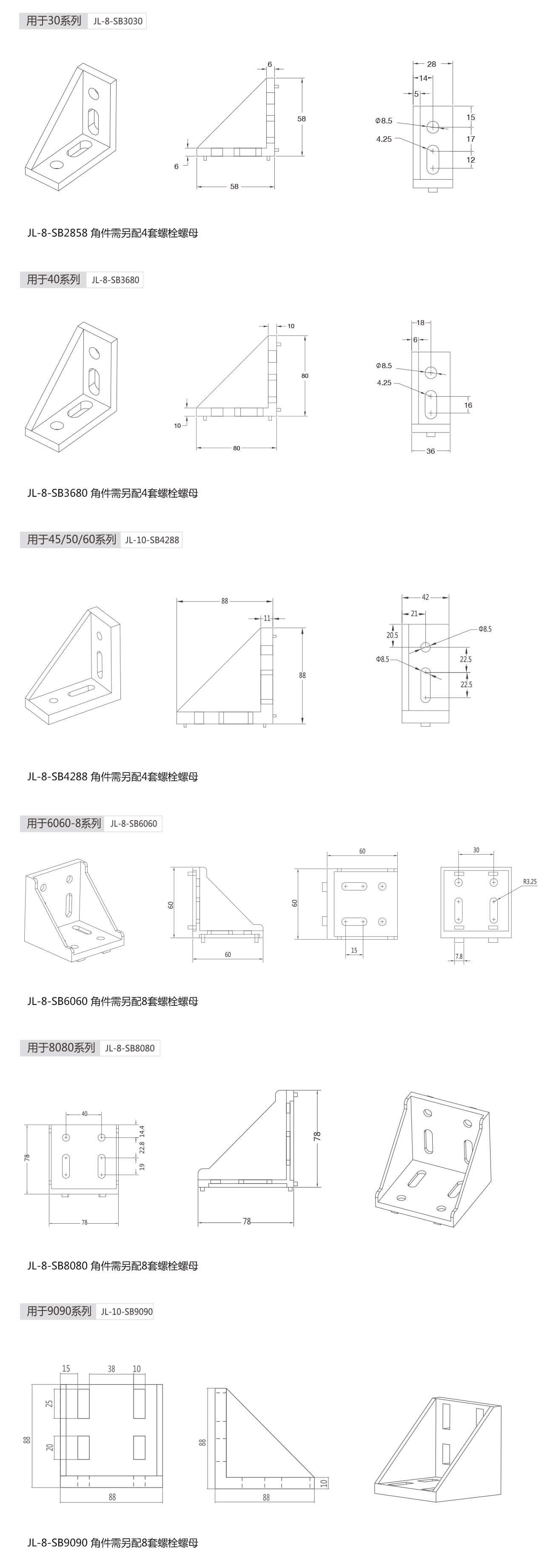 常用于受強力或震動的型材與型材連接點的支撐與固定,連接用的T型螺栓及螺母需另配。